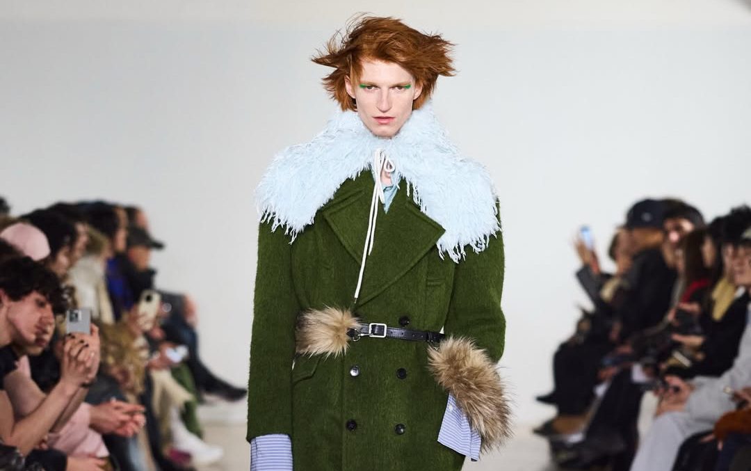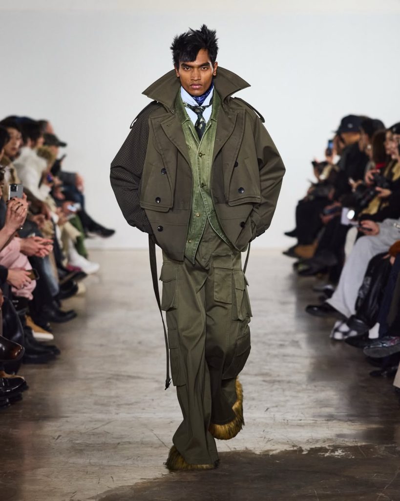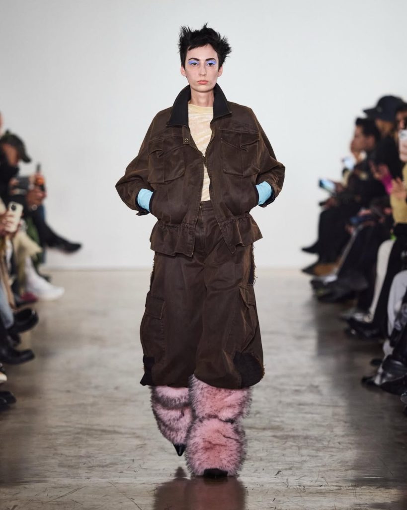 The silhouettes play with contrasts: printed denim paired with faux fur, structured tailoring softened by more organic textures, delicate silk set against technical fabrics. Each piece feels conceived as a meeting point between two worlds.