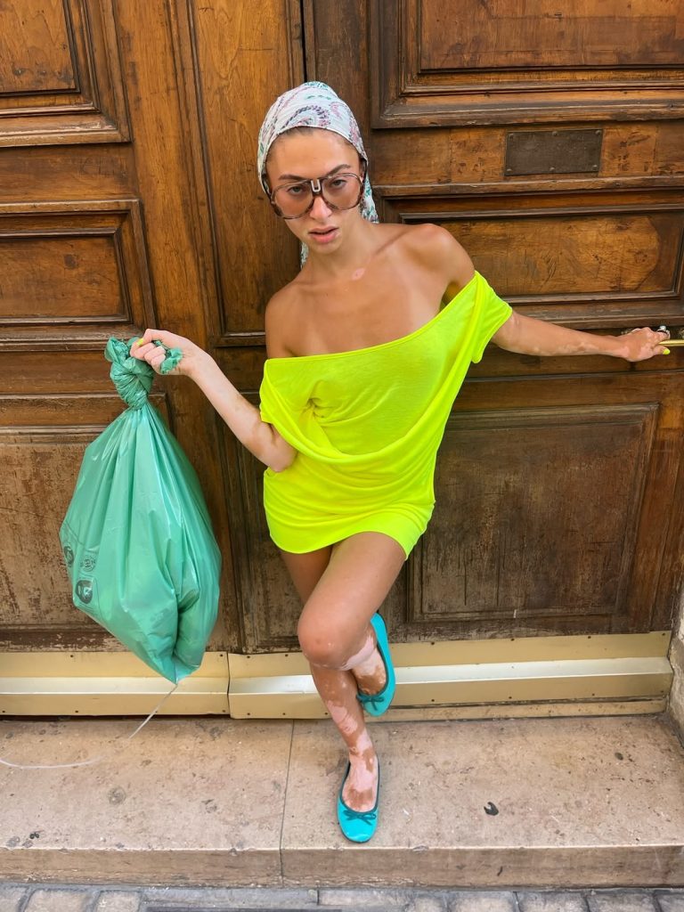 The rise of “cunti cunta,” a term coined by Loeva, co-founder of the JUDE Party, crystallizes a new way of approaching neon. This attitude stands in direct opposition to the clean girl aesthetic. Acid-yellow asymmetric dresses, unapologetic neon mini shorts, Stabilo-style swimsuits and XXL jewelry straight out of the 1980s: here, neon is not a mere accent but a tool for embracing kitsch and asserting a boldly colorful identity.