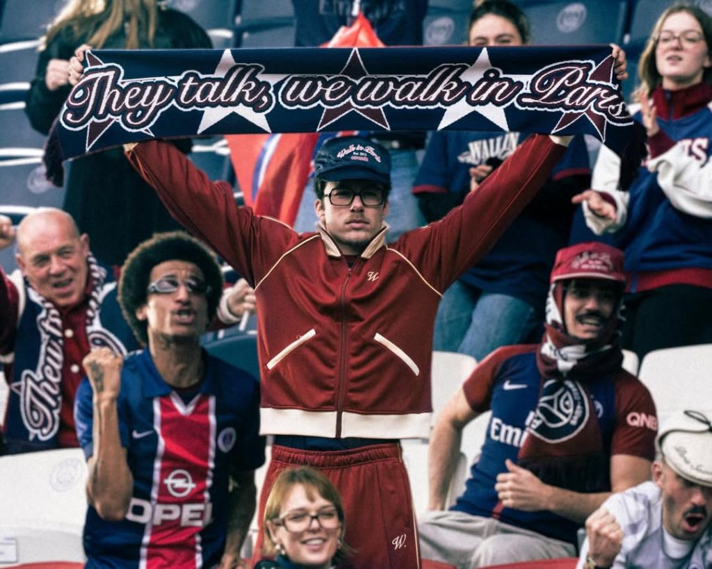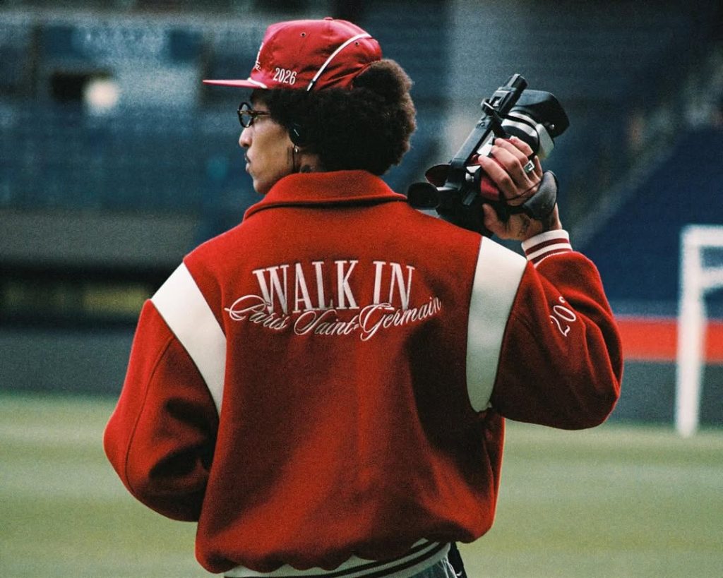 At Walk in Paris, the alliance feels almost tautological. The red varsity jacket, a signature piece with a vintage flair naturally echoes the club’s iconography. The campaign, shot in an empty Parc des Princes, playfully diverts the historic slogan to adopt the line: “You talk, we walk.”