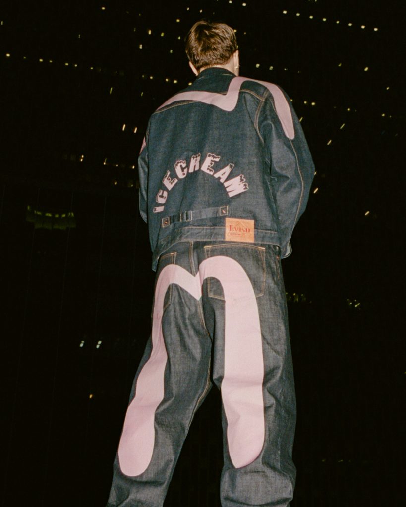 The iconic logos of both brands come together: Evisu’s seagull merges with Icecream’s Running Dog to create a hybrid emblem. A graphic nod to their respective worlds. Denim, the beating heart of the collection, is highlighted through selvedge pieces, those Japanese fabrics with finished edges, known for their durability and celebrated craftsmanship worldwide.