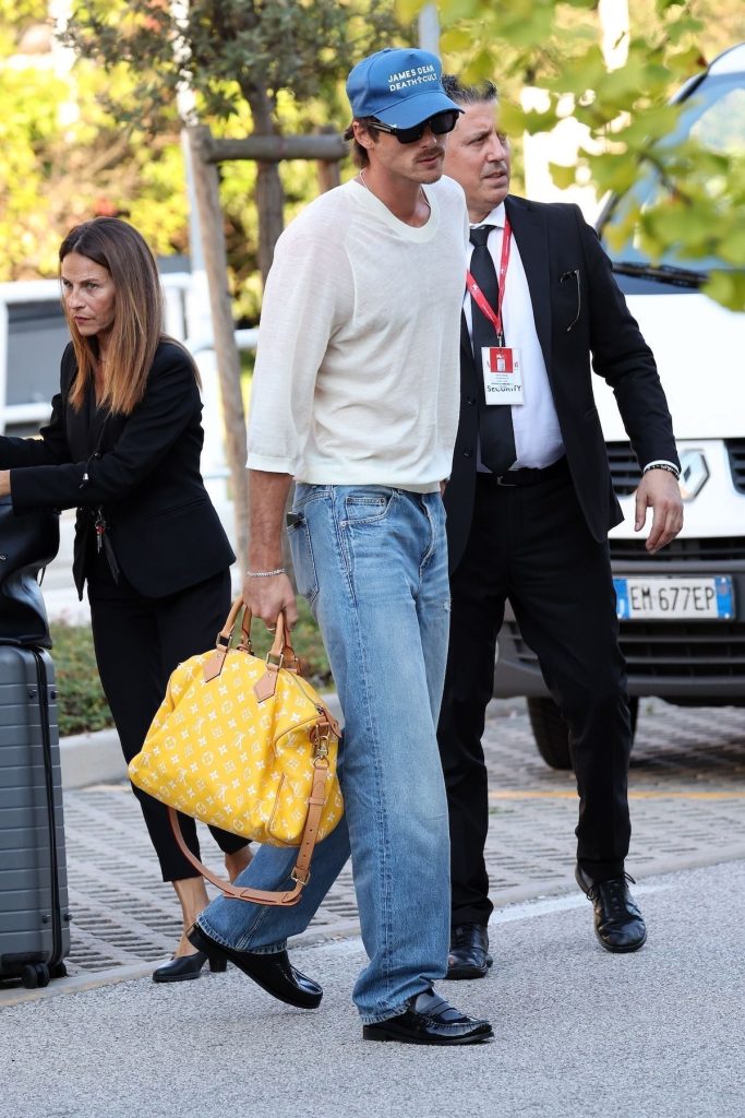 The real break happens elsewhere, particularly with the shoulder carry. A gesture more traditionally associated with the female wardrobe. Jacob Elordi has clearly grasped this: he alternates, without hierarchy, between a canary-yellow Louis Vuitton Keepall and a mini denim Chanel bag, deliberately blurring gender boundaries. Long before them, Pharrell Williams had already paved the way, making the handbag a central element of his image.