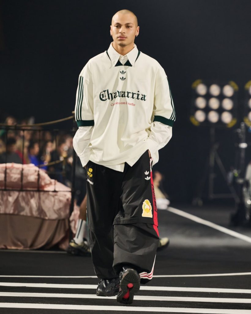 A long-standing collaboration, the union between Willy Chavarria and adidas feels particularly timely intersecting with the upcoming 2026 FIFA World Cup, set to be hosted by Canada, the United States and Mexico, the designer’s country of origin. As an official sponsor of the tournament, adidas becomes a true platform for Chavarria’s expression. Far from a simple reinterpretation of the iconic 1986 Mexican jersey, the designer offers a holistic vision: reworked football boots, a ball tucked under the arm, baggy shorts emblazoned with the Mexican flag. The appearance of Marcelo on the runway completes this tribute to football culture.