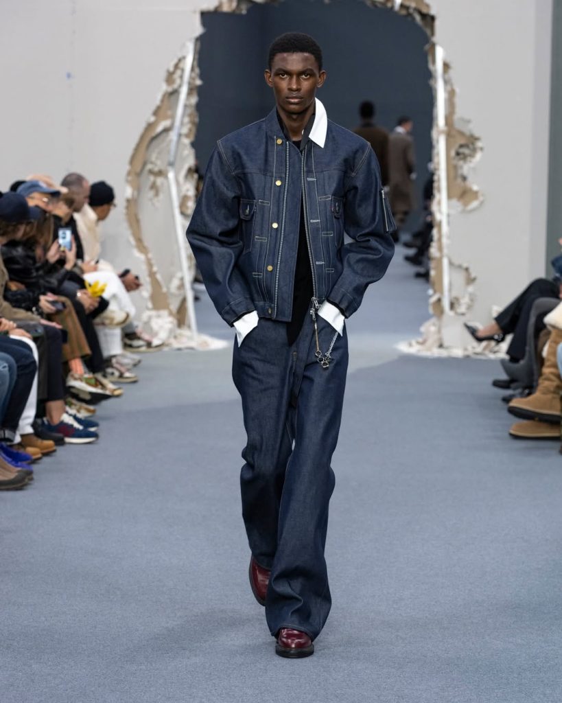 After paying tribute to James Dean last season, Sacai and Levi’s extend their dialogue around denim. This time, denim jackets emerge from beneath tailored suits, playing with surprise and layering effects. A rich proposition that stays true to the Japanese label’s hybrid DNA. In parallel, Sacai unveils a third collaboration with A.P.C., reworking motifs drawn from the French brand’s archives.