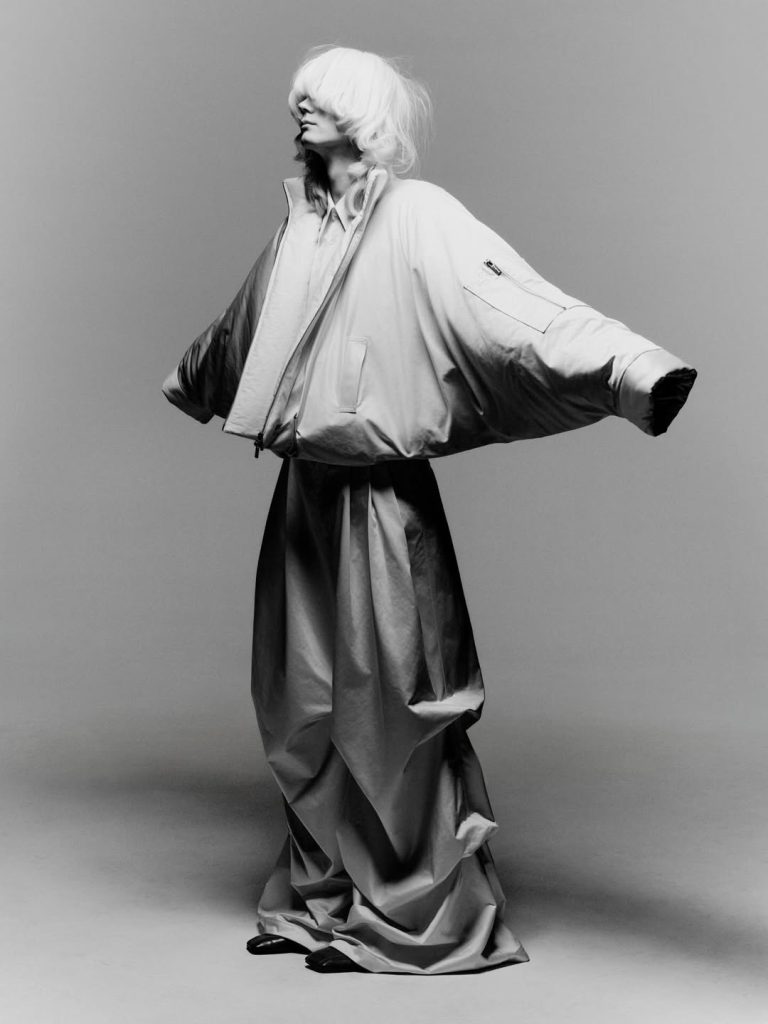 Les teintes neutres et froides, les effets volontairement vieillis et les volumes imparfaits racontent des vêtements chargés d’histoire, tournés vers un futur incertain. Un manteau aux boutons placés dans le dos et porté avec une épaule tombante, incarne cette volonté d’exposer l’imperfection.