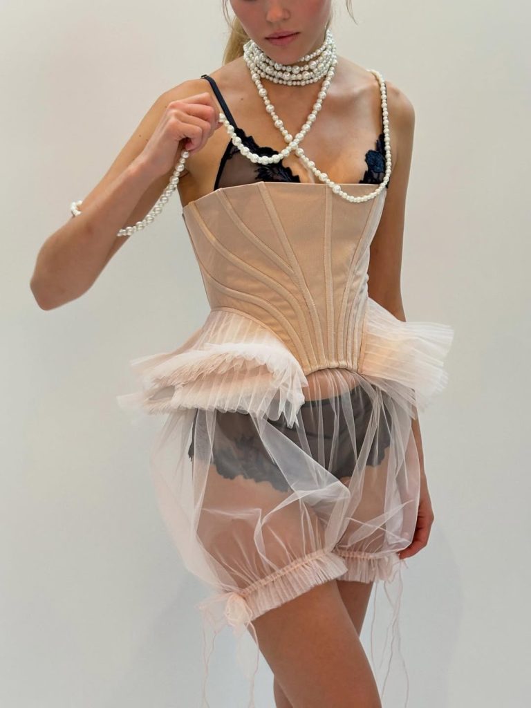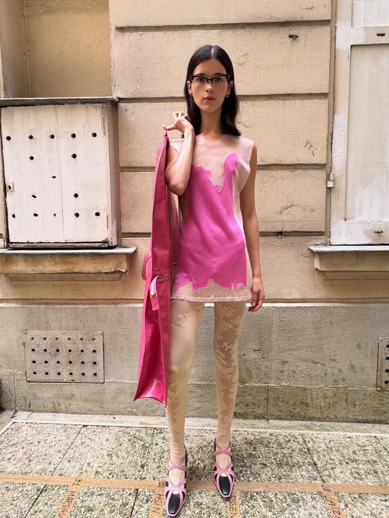Si son style personnel est assez minimaliste, son travail emprunte beaucoup au sportswear et à la danse. Elle aime jouer sur la mise en scène des corps : les chaussettes comme signature, et la peau comme matière première. Passionnée d’archives, elle redonne vie à des pièces oubliées. On la suit pour son art des superpositions entre vêtements et sous-vêtements.