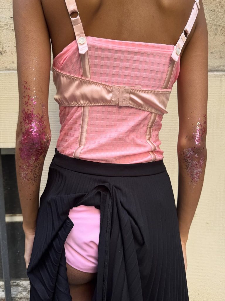Elle affectionne les silhouettes féminines et hyper-sensuelles et a un intérêt marqué pour les matières et les coupes qui épousent le corps sans le contraindre. Par extension, elle a fini par se mettre aussi en scène. En résultent notamment une collaboration avec Weekday il y a un an, puis un édito intitulé Reel & Intimate pour Hube. On la suit pour son approche sensible du corps et ses tenues à la fois élégantes et désinvoltes.
