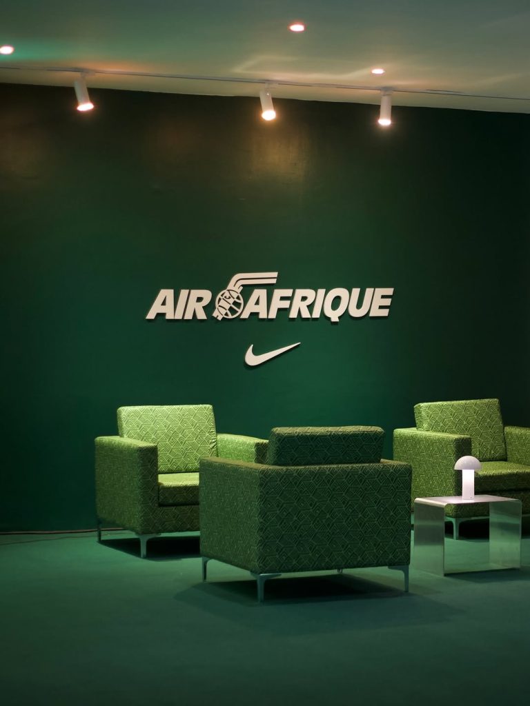 En octobre 2025, Air Afrique dévoile une collaboration d’envergure avec Nike autour d’un modèle inédit, la RK61. Paire hybride entre le mocassin et la sneaker, elle allie élégance et confort, tout en intégrant des éléments symboliques forts : bulle d’air visible, zip frontal et intérieur en tartan, en hommage aux sièges originaux de la compagnie aérienne. Même son nom, RK61, fait référence au code de vol historique d’Air Afrique.