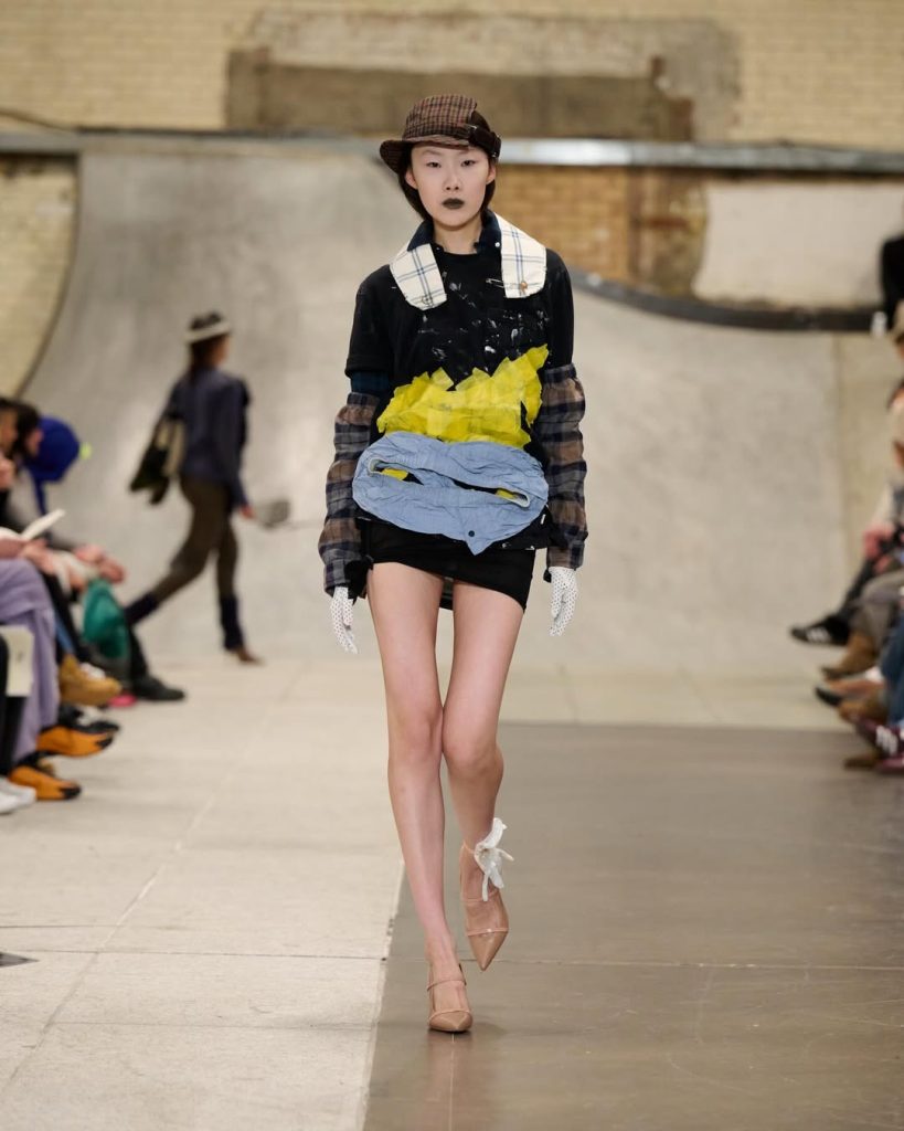 Chez Chopova Lowena, on savoure les influences multiples, quelque part entre le regency core et une matinée sur un green impeccablement tondu. Les jupes plissées, signatures du duo, sont bien présentes mais derrière ce design, une approche avant tout circulaire avec la réutilisation de pièces issues d’anciennes collections.