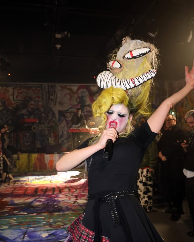 Dans les sous-sols du Dover Street Market, à Paris, le designer britannique a transformé sa présentation officielle en un spectacle immersif. Le groupe Baby Berserk a joué en direct, les mannequins ont évolué au rythme de la musique, tandis que les murs et le sol, recouverts de toiles peintes par le designer lui-même, ont composé une scénographie totale.