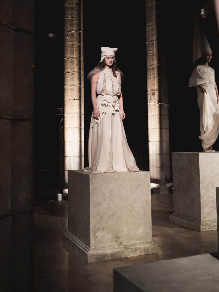 Ida Immendorff, designer et costumière, fille des artistes Oda Jaune et Jörg Immendorff, a dévoilé sa toute première collection couture intitulée Hi, Way to Heaven? dans une mise en scène profondément poétique. Les tissus exclusivement blancs rappellent les draps utilisés pour recouvrir les œuvres d’art. Ce choix chromatique radical confère à l’ensemble une unité presque spectrale.