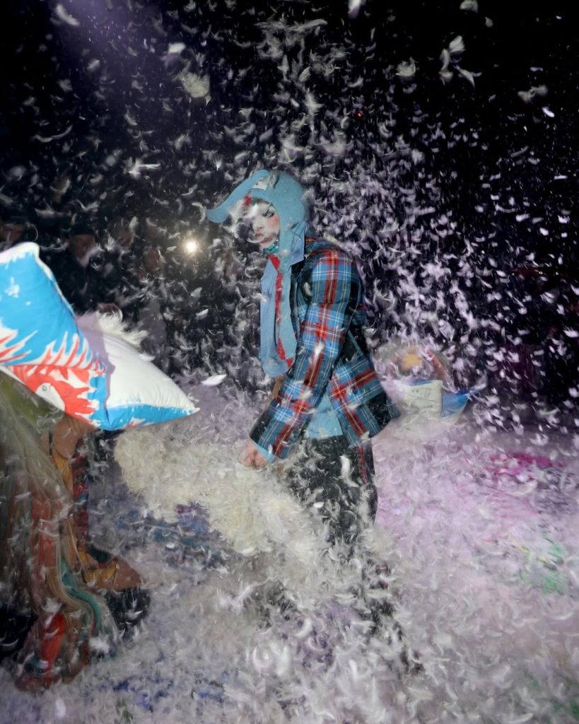 Le catwalk figé, où les invités restent impassibles, semble désormais appartenir au passé. Le vêtement vit, respire, interagit avec l’espace et le public. Le défilé s’est transformé en performance, au carrefour du concert et de l’installation artistique, rappelant l’esprit punk dont se réclame LOVERBOY.