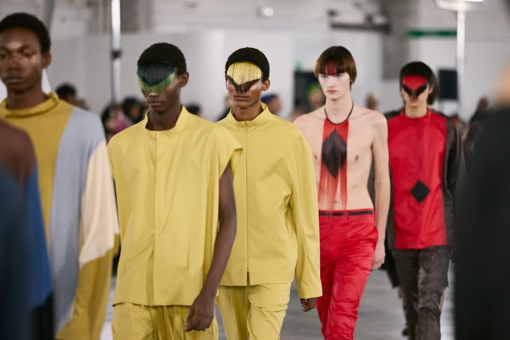 Chez Rick Owens, Kiko Kostadinov ou encore LOVERBOY, des mèches vives tombent sur les yeux, altérant la perception du visage et, par extension, celle du vêtement. La coiffure agit alors comme un filtre visuel, brouillant les repères et accentuant la dimension dramatique des looks.