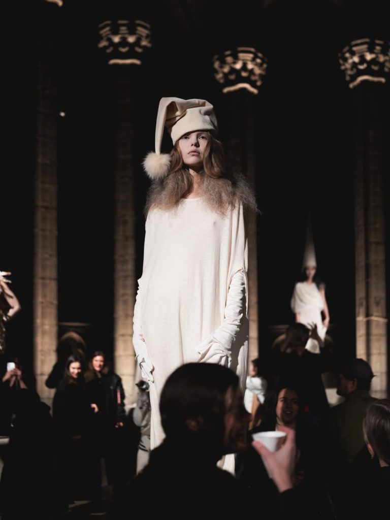 Les silhouettes, entièrement vêtues de blanc, évoquent des créatures venues d’un autre monde. Dentelle délicate, masques, cornes, capuches et chapeaux pointus composent un univers onirique. Si la monochromie pourrait sembler uniforme, chaque tenue se distingue par sa construction et sa symbolique, racontant des fragments d’histoires différentes.