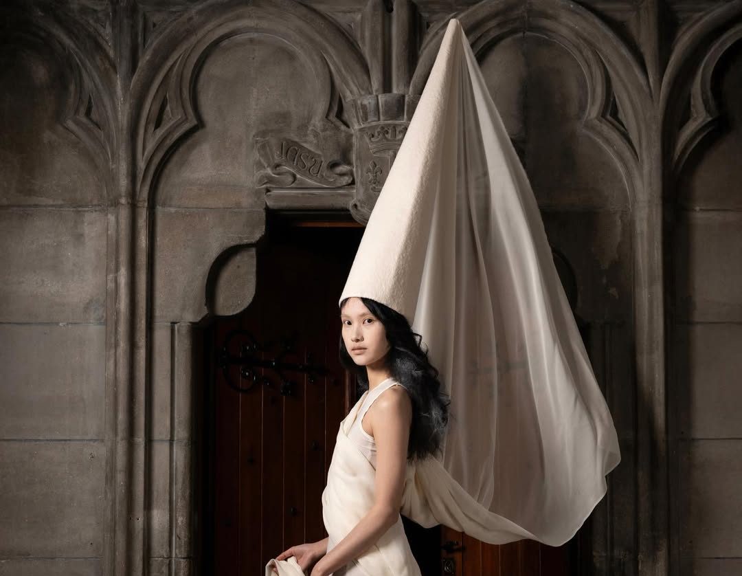 Les silhouettes, entièrement vêtues de blanc, évoquent des créatures venues d’un autre monde. Dentelle délicate, masques, cornes, capuches et chapeaux pointus composent un univers onirique. Si la monochromie pourrait sembler uniforme, chaque tenue se distingue par sa construction et sa symbolique, racontant des fragments d’histoires différentes.