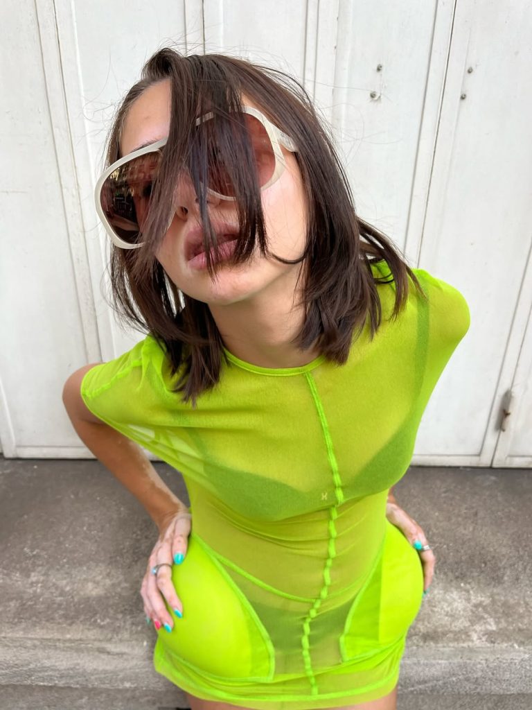 L’émergence du « cunti cunta », expression créée par Loeva, cofondatrice des JUDE Party, cristallise une nouvelle façon d’appréhender le néon. Cette attitude s’oppose frontalement à la clean girl. Robe asymétrique jaune acide, mini-short fluo assumé, maillot de bain façon Stabilo, bijoux XXL à l’esthétique tout droit sortie des années 1980. Le néon n’y est pas un simple détail, mais un moyen de jouer avec le kitsch et d’affirmer une identité haute en couleur.