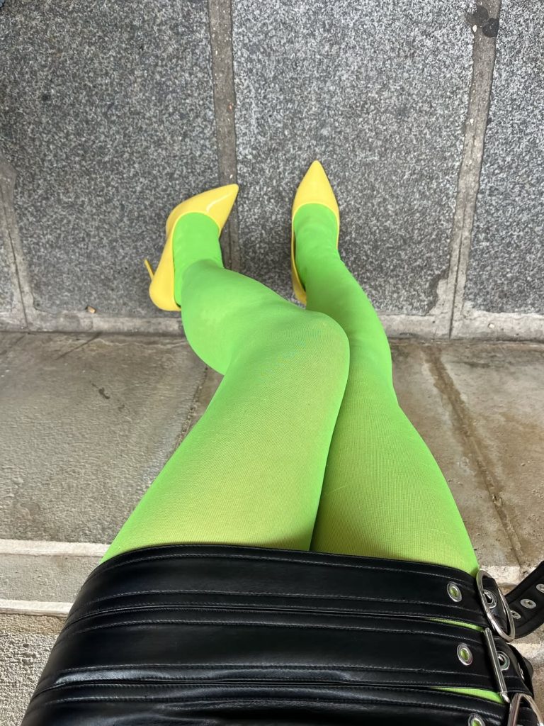 Pour celles et ceux qui hésitent, les détails constituent une porte d’entrée idéale. Certaines silhouettes s’animent grâce à une paire de chaussettes lime ou un collant acidulé. Le duo d’influenceuses Manon et Lilas glissent régulièrement du fluo dans leur silhouette, notamment en jouant avec la tendance des bas apparents.