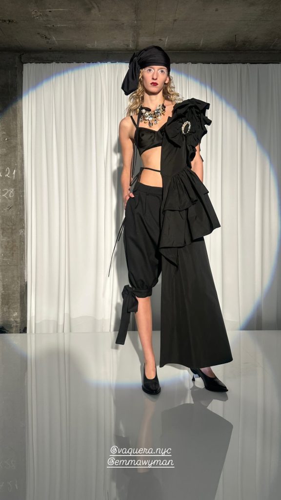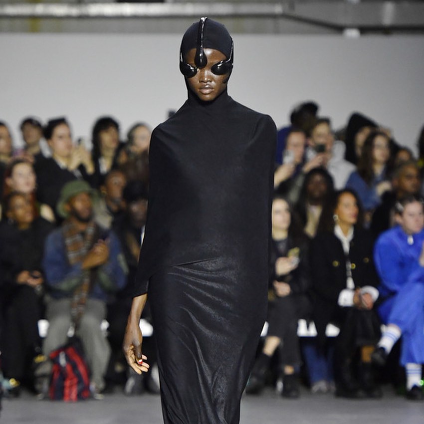 Cette saison, le créateur présentait « Stonehaven », une collection immersive, dévoilée autour d’un catwalk en spirale, en forme de @. Silhouettes mutantes, textures hybrides, détails gores : Mizra continue d’explorer une esthétique post-humaine, dystopique, qui a donné le ton dès cette ouverture officieuse mais remarquée. Parmi les surprises du show : la chanteuse Théodora, qui foulait pour la première fois un podium.