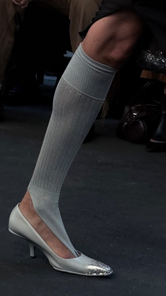 Une tendance semble se dessiner dès cette première journée : les années 1980 s’invitent à nouveau sur les podiums. Lignes épaulées, tailles marquées, volumes dramatiques : plusieurs marques — Saint Laurent, Vautrait, Vaquera — font converger leurs références.
