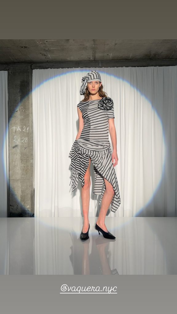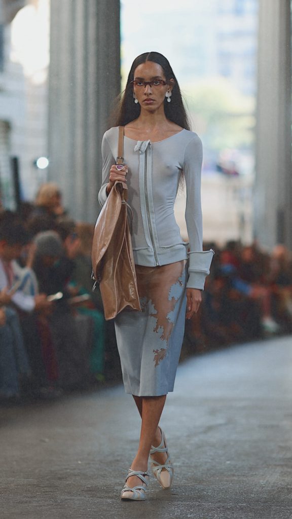 La collection, intitulée « Quick Change », porte bien son nom. Les mannequins donnent l’impression d’avoir été surprises en pleine préparation : jupes coincées dans les sous-vêtements, paillettes encore visibles sur la peau, tee-shirts à moitié enfilés. Certaines ajustent même leur tenue en direct, faisant tomber des manches ou déplaçant des couches. Les soutiens-gorge se portent par-dessus les tops, les housses de pressing se transforment en sacs XXL. Une esthétique de l’imperfection assumée, du geste interrompu, presque volé. Un pied-de-nez au culte de la « clean girl » et à son obsession de la maîtrise, grande tendance du début d’année.