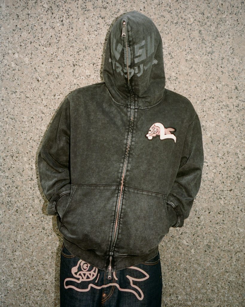 Les logos cultes des deux marques fusionnent : la mouette d’Evisu s’unit au Running Dog d’Icecream pour donner naissance à un emblème hybride, clin d’œil graphique à leurs univers respectifs. Le denim, cœur battant de la collection, est sublimé dans des pièces selvedge — ces toiles japonaises à bords finis, gage de solidité et marque d’un savoir-faire à la renommée mondiale.